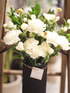 This stunning and elegant bouquet is arranged with white carnations, Craspedia, and ruscus. It can vividly portray a vision of white and is sure to stun.