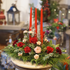This holiday centerpiece features roses mixed with carnations. Pittosprom, myrtle, cedar, douglas fir and white pine add even more of a festive feel to this Christmas classic.