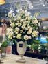 A dreamy, lush white and green arrangement with sprays of roses, ranunculus, anemones, larkspur, gerbera, and much more.