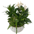 Tropical plants including White Anthurium and Peace Lily are planted in a white round ceramic bowl.