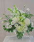 White hydrangeas, lisianthus, and soft green accents come together in a graceful arrangement symbolizing comfort, love, and eternal remembrance. Perfect for memorial services, celebration of life ceremonies, or as a refined expression of sympathy.